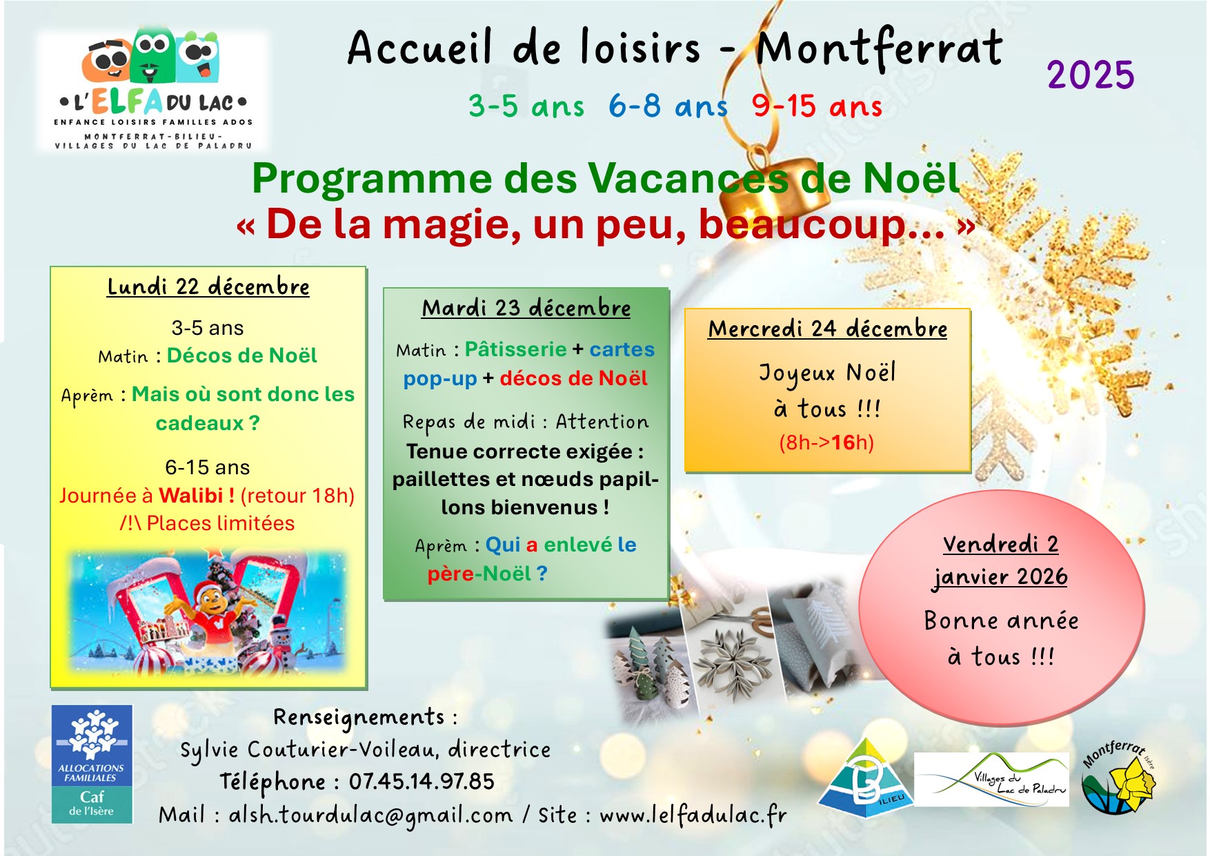 Voici le programme des vacances de Noël pour nos jeunes ! Une sortie à Walibi le lundi 22 et des activités noëlistiques le mardi 23 😁